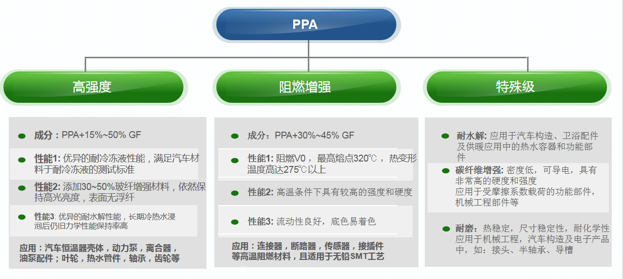 一種半結晶性· 熱塑性芳香族聚酰胺,俗稱芳香族高溫尼龍,長期工作溫度可達180℃,短期耐溫可達290℃。PPA分子結構中的芳香族成分,使得以PPA為原材料制作出的零件,在熱、電、物理及耐化學品性方面都有良好的表現,特別是在高溫條件下仍具有高強度及極佳尺寸穩定性的特點。